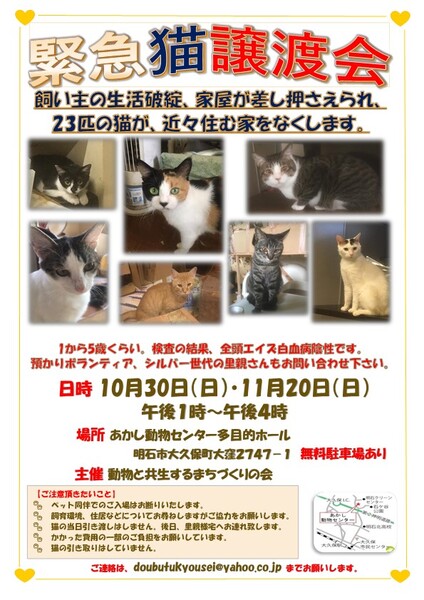 | イベント内容 | 明石市でまた多頭飼育崩壊。23匹の猫が近々家を追われます。 里親様と一時預かり様を募集しています。 飼い主は生活破綻。家屋は差し押さえられ、いつ退居を言い渡されるかわからない、里親さんが決まらない場合は、行政に引き取っていただくことも視野に入れざるを得ない厳しい状況です。 室内は、糞尿が堆積し、汚い、臭い、苦しい環境に3年あまり暮らしてきましたが、餌はかろうじて与えられていたようです。殆どが赤ちゃんの時に保護したもので、おとなしい性格で姿が可愛いです。全頭エイズ白血病共に陰性。 ゴミを大方片付け、とりあえず猫を置く部屋をきれいにし、全頭避妊去勢手術、検査、ワクチンを終え、可愛そうですが、ケージに入ってもらっています。これから新しいお家探しを始めます。 命を繋いでいただきますようご協力をお願いします。 ★緊急「猫譲渡会」開催★ 10月30日(日)・11月20日 13時から16時 あかし動物センター多目的ホールにて 12月以降の譲渡会の予定は下記FBをご参照ください https://www.facebook.com/akasidoubutu/ |