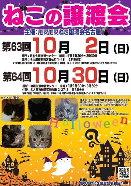| イベント内容 | モフモフねこ譲渡会名古屋 猫たちの幸せなお家探しのために譲渡会を開催しております。 個人ボランティアの集まりです。 自分たちの出来ることから頑張っております! 一匹でも幸せになれる猫が増えますように 場所 瑞穂生涯学習センター 第3集会室 住所 名古屋市瑞穂区惣作町2-27-3 時間 13時30分~15時30分 交通機関等 地下鉄「妙音通」下車1番出口より徒歩8分 駐車場19台(満車の場合は近隣コインPをご利用ください) 参加猫の情報は下記モフモフねこ譲渡会名古屋ブログにてご確認ください。 https://mofumofuneko4.fc2.net/ 新型コロナウイルス対策として ・会場は換気を定期的に行います。 ・密を避けるため、入場制限をさせていただきます。 ・入口にて手指の消毒、検温をお願いいたします。 ・ご来場の際はマスク着用をお願いいたします。 ・咳・発熱・倦怠感等の体調のすぐれない方はご来場を控えていただきますよう、お願いいたします。 ・新型コロナウイルスの影響により急遽中止になる場合もありますので、モフモフねこ譲渡会名古屋ブログにてご確認の上、ご来場ください。 【譲渡会について】 ・譲渡会は入場無料、予約不要です。お気軽にご参加ください。 ・会場へのお問い合わせはご遠慮ください。 ご質問は下記メールアドレスへお願いいたします。 mofumofuneko4☆gmail.com ☆を@に変更してお問い合わせください。 ・猫の引き取りはしておりません。 ・譲渡会当日に猫をお渡しすることはありません。 ・保護主によって譲渡条件が違う場合があります。 ・参加予定でも譲渡会前にトライアルになる場合があります。 ご希望の猫がいましたらまずはお問い合わせをお願いいたします。 【参加猫について】 ・ノミ駆除、駆虫、トイレ躾、ワクチン3種接種済。 ・年齢や健康状態に応じて、避妊手術を行っております。 ・参加予定で紹介していても当日体調不良等で欠席になる場合があります。 【譲渡の約束事】 ・ペット飼育可の住宅にお住まいの方。 ・完全室内飼育。 ・脱走防止の対策をしていただける方。 ・避妊手術未実施の場合、避妊手術 の実施と報告をしていただける方。 ・ご家族全員が猫を飼うことに同意していること。 ・譲渡後、しばらく定期連絡を入れていただける方。 *お一人暮らしの方、60歳以上の方は、身内の方の保証が必要となる場合がございます。 #名古屋瑞穂区 #瑞穂生涯学習センター #譲渡会 #保護猫 #地域猫 #さくらねこ #tnr #里親募集 #里親募集中 #猫 #ねこ #殺処分ゼロ #買わずに飼おう #モフモフねこ譲渡会名古屋 #ペットショップに行く前に #譲渡会のお知らせ #猫と暮らしたい |