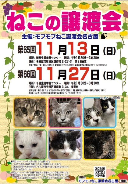 | イベント内容 | モフモフねこ譲渡会名古屋 猫たちの幸せなお家探しのために譲渡会を開催しております。 個人ボランティアの集まりです。 自分たちの出来ることから頑張っております! 一匹でも幸せになれる猫が増えますように 場所 千種生涯学習センター 美術室 住所 名古屋市千種区振甫町3-34 時間 13時30分~15時30分 交通機関等 地下鉄「池下」下車北へ徒歩約15分、市バス「振甫町」下車すぐ 駐車場 1回300円 31台(満車の場合は近隣コインパーキングをご利用ください) 参加猫の情報は下記モフモフねこ譲渡会名古屋ブログにてご確認ください。 https://mofumofuneko4.fc2.net/ 新型コロナウイルス対策として ・会場は換気を定期的に行います。 ・密を避けるため、入場制限をさせていただきます。 ・入口にて手指の消毒、検温をお願いいたします。 ・ご来場の際はマスク着用をお願いいたします。 ・咳・発熱・倦怠感等の体調のすぐれない方はご来場を控えていただきますよう、お願いいたします。 ・新型コロナウイルスの影響により急遽中止になる場合もありますので、モフモフねこ譲渡会名古屋ブログにてご確認の上、ご来場ください。 【譲渡会について】 ・譲渡会は入場無料、予約不要です。お気軽にご参加ください。 ・会場へのお問い合わせはご遠慮ください。 ご質問は下記メールアドレスへお願いいたします。 mofumofuneko4☆gmail.com ☆を@に変更してお問い合わせください。 ・猫の引き取りはしておりません。 ・譲渡会当日に猫をお渡しすることはありません。 ・保護主によって譲渡条件が違う場合があります。 ・参加予定でも譲渡会前にトライアルになる場合があります。 ご希望の猫がいましたらまずはお問い合わせをお願いいたします。 【参加猫について】 ・ノミ駆除、駆虫、トイレ躾、ワクチン3種接種済。 ・年齢や健康状態に応じて、避妊手術を行っております。 ・参加予定で紹介していても当日体調不良等で欠席になる場合があります。 【譲渡の約束事】 ・ペット飼育可の住宅にお住まいの方。 ・完全室内飼育。 ・脱走防止の対策をしていただける方。 ・避妊手術未実施の場合、避妊手術 の実施と報告をしていただける方。 ・ご家族全員が猫を飼うことに同意していること。 ・譲渡後、しばらく定期連絡を入れていただける方。 *お一人暮らしの方、60歳以上の方は、身内の方の保証が必要となる場合がございます。 #名古屋千種穂区 #千種生涯学習センター #譲渡会 #保護猫 #地域猫 #さくらねこ #tnr #里親募集 #里親募集中 #猫 #ねこ #殺処分ゼロ #買わずに飼おう #モフモフねこ譲渡会名古屋 #ペットショップに行く前に #譲渡会のお知らせ #猫と暮らしたい |