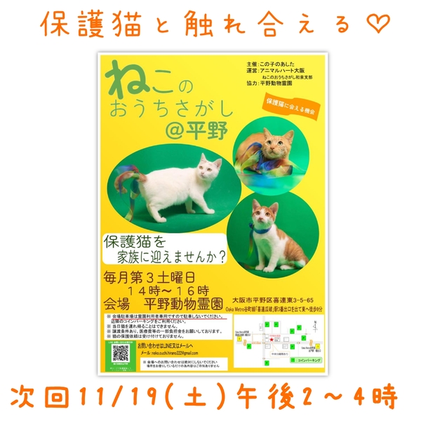 | イベント内容 | ねこのおうちさがし@平野 開催日 : 毎月第3土曜日 (次回11/19) 時間 : 午後2時~4時 場所 : 平野動物霊園 大阪府大阪市平野区喜連東3-5-65 Oaka Metro谷町線「喜連瓜破」駅、3番出口を出て東へ徒歩約9分 ☆会場へのお問い合わせは固くお断りします。 ☆平野動物霊園様の駐車場は霊園へのお参りのお客様専用ですので駐車しないでください。 保護猫里親会にお車でお越しの方は近隣のコインパーキングをご利用ください。 ※感染拡大の状況によっては急遽中止となる場合もございます。 ☆里親希望申込は先着順ではありません☆ 里親会終了後に検討させていただきますので、分散してご見学くださいますようご協力お願いします。 ★譲渡には完全室内飼育、同意書への署名・捺印などの条件、医療費等の一部負担があります。 ★猫さんは、後日お届けとなります。 当日連れて帰ることはできません。 ★参加予定の猫さんは、里親会の前に里親さまが決定する場合や、体調により不参加となる場合があります。 主催: この子のあした 運営: アニマルハート大阪 ねこのおうちさがし和泉支部 協力: 平野動物霊園 参加猫紹介ブログ https://ameblo.jp/konoasu222/ |