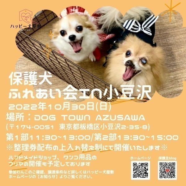 | イベント内容 | ドッグタウン小豆沢で開催のふれあい会のご案内です! 混雑を避けるため、整理券配布のうえ入れ替え制とさせていただきます。 ★整理券は各部の開始30分前より配布いたします。ご来場人数によってはご入場できない場合がございますので、あらかじめご了承ください。 (事前にホームページよりお見合いのお申込みをされている場合は、整理券不要にてご入場いただけますので、会場でスタッフにお伝えください) 日程:2022年10月30日(日) 時間:11時30分~15時00分 第1部:11時30分~13時00分 (整理券配布時間11時00分~11時30分) 第2部:13時30分~15時00分 (整理券配布時間13時00分~13時30分) 場所:ドッグタウン小豆沢(東京都板橋区小豆沢2-35-8) 【ご注意とお願い】 ※保護わんこ達はデリケートです。必ずスタッフの指示に従ってふれあって下さい。 ※感染対策の為マスクを着用の上、ソーシャルディスタンスにご協力下さい。 ※当日参加わんこを連れて帰ることは出来ません。 ※わんこのお申し込みは、ふれあい会ご来場後にホームページにあります【里親になる条件】を先にお読みになってからお願い致します。 ※お家のわんちゃんをお連れの時は、あらかじめオムツ又はマナーベルトとリードの着用をした状態でご入場をお願い致します。 ※わんちゃんのサイズ、吠えや攻撃性がある場合は入場をお断りさせて頂きますので、あらかじめご了承下さい。 ※新型コロナウイルスの感染状況により、中止や参加方法が変更する場合がございます。 ハッピー犬屋敷ホームページの「お知らせ」でご確認の上ご来場下さい。 ★皆さま、どうぞマナーを守ってのご来場をお願いいたします。 沢山の方のご来場を、スタッフ一同と可愛い保護わんこ達と一緒にお待ちしています! ●参加予定ワンコは、ハッピー犬屋敷ホームページの下記よりご確認くださいませ。 ↓ https://inuyasiki.com/2022/10/%e3%80%90%e6%9d%b1%e4%ba%ac%e6%96%b9%e9%9d%a2%e3%80%91%e5%b0%8f%e8%b1%86%e6%b2%a2%e3%81%b5%e3%82%8c%e3%81%82%e3%81%84%e4%bc%9a%e9%96%8b%e5%82%ac%e3%81%ae%e3%81%8a%e7%9f%a5%e3%82%89%e3%81%9b/ |