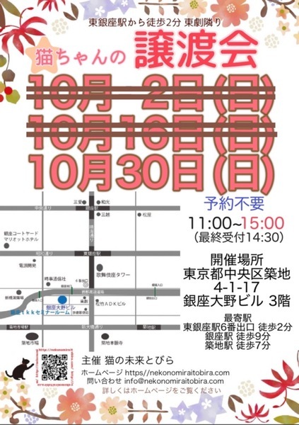 | イベント内容 | 東銀座で保護猫の譲渡会を開催しています「猫の未来とびら」です♪ 恵まれない環境にいる猫たちが未来へのとびらを開いて幸せなご縁に繋がる橋渡しをしていきます。 たくさんの猫ちゃんと保護主・スタッフ一同みなさまのご来場を心よりお待ちしています! 子猫ちゃん〜成猫ちゃんまで参加します♪ ※ご来場頂く方と私たち保護主、スタッフの安心と安全の為、感染リスクを限りなく低減させる為、私たちが出来うる対策をしてお待ちしております※ 【ご来場いただく皆様には下記についてお願い致します】 ★不織布マスクの着用をお願い致します。 (マスク着用のない方は入場出来ません) ★譲渡会場にお入り頂く前に検温・手洗いと手の消毒、検温をお願い致します。 ★ソーシャル・ディスタンス(人と人との間隔を開ける)をお願い致します。 ★熱のある方や体調の優れない方は譲渡会への来場を見合わせて頂けますよう、お願い致します。 ★来場者数によりましては人数制限もありますので長時間お待たせてする場合もございます。 予めご了承下さい。 コロナウイルス感染拡大防止の為、このような厳しいお願いで大変恐縮ですが何卒ご理解とご協力、ご了承をいただけますようお願い致します。 ★☆★★☆★★☆★★☆★★☆★★☆★★☆★★☆★★☆★ ★開催日時 2022年10月30日(日) 11:00~15:00(最終受付 14:30) ★会場 東京都中央区築地4-1-17 銀座大野ビル 3階 (東劇となり) ★最寄駅 東銀座駅 6番出口 徒歩2分 銀座駅 徒歩9分 ・築地駅 徒歩7分 駐車場は当ビル又は近隣のコインパーキング等をご利用ください。 会場への直接のお問い合わせはご遠慮くださいませ。 ★☆★★☆★★☆★★☆★★☆★★☆★★☆★★☆★★☆★ 会場で猫ちゃんと触れ合ってご縁を繋いでください。 里親様・猫ちゃんが双方、幸せな家族になれるよう保護主・スタッフがサポート致します。 ご不安な事はお気軽にご相談ください。 入場無料です。事前のご予約は不要です。 当日猫ちゃんの引き渡しはございません。 後日、保護主が里親様宅へお届けいたします。 ※参加予定猫ちゃんは、急な体調不良等で不参加になる場合もございます。 開催当日の朝、当会ブログにて不参加の最新情報を掲載致しますのでご確認をお願い申し上げます。 ◇譲渡に関してのお願い・基本条件 1.家族の一員として終生最期まで愛育下さい。 2.完全室内飼い・ペット可のお住まい(契約書を拝見致します) 3.脱走防止対策 4.避妊・去勢手術 5.里親様のご自宅へのお届け 6.譲渡誓約書への署名捺印・身分証明書の提示 7.医療費譲渡金のご負担 8.定期報告 9.トライアル期間有り ※保護主により譲渡条件は異なりますので会場で直接ご相談ください。 60才以上の方のみのご家庭、未成年の方、単身の方、同棲中の方、 小学生低学年以下のお子様のいる方、必要な脱走対策を施していただけない方は譲渡をご遠慮頂く場合もございますのでご了承ください。 仔猫の場合は主にお世話される方のご年齢は55歳までとさせて頂きます。 オーバーする方はご相談くださいませ。 小さな子猫の譲渡は体重が1kgになってからのお届けやお留守番の無い(少ない)ご家庭を希望いたします。 医療費譲渡金に関しましては詳しくはホームページの 【譲渡に関してのお願い】【譲渡の流れ】をご覧くださいませ。 ~主催 猫の未来とびら~ |