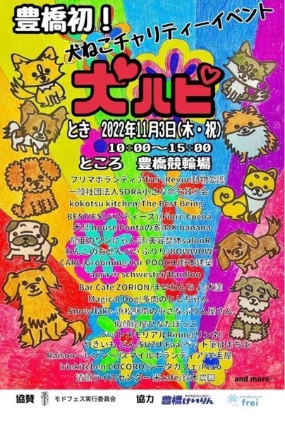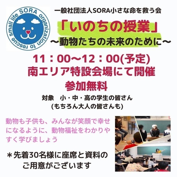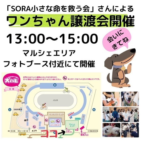 | イベント内容 | 愛知県の一般社団法人SORA小さな命を救う会です。 保護犬のお見合い会やマルシェでのチャリティイベントに参加致します。 また、南エリア特設会場で『「いのちの授業」〜動物たちの未来のために〜』を開催致しますので、ぜひご参加ください。 チャリティーイベントでの収益は、全て保護犬の医療など保護活動使わせていただきます。 お出かけに気持ちいい季節です。 是非、ご家族みなさんで遊びにいらしてくださいね。 |