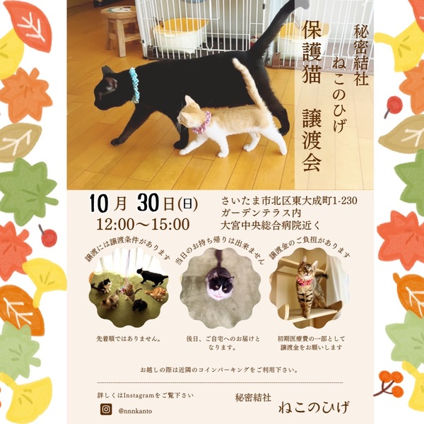 | イベント内容 | 【秘密結社ねこのひげ/保護猫譲渡会】 10/30(日) 12:00~15:00 さいたま市北区東大成町1-230 ガーデンテラス内にて開催します☆ 今回も引き続き! 【仔猫+幼猫祭】! 3~6ヶ月齢の仔たちが20頭ほど キャッキャ♪キャッキャ♪と参加します。 もちろん激あまスイートな もひもふオトナ猫さんも♪ 家族にするなら保護猫だべ♪♪ こんなご時世だけど 新しい家族と笑顔で暮らしたい♪ という方は是非会いにいらしてください♡ 新型コロナ対策として 受付名簿のご記入、消毒 マスク着用などのご協力をお願い致します。 物販の方も屋外スペースにて こじんまり置かせて頂きますので ご近所の方はふらりと是非 お立ち寄りくださいませ。 ご不明な点がございましたら インスタグラム @秘密結社ねこのひげ の DMまでお問い合わせ下さい♪ |