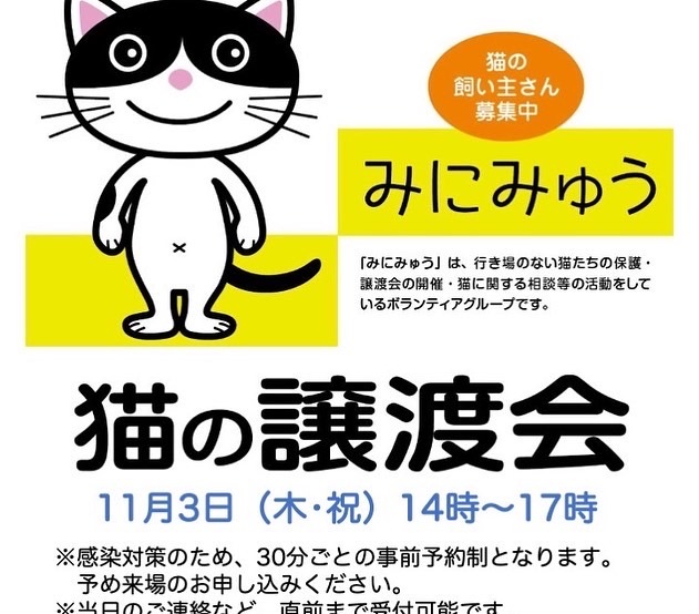 | イベント内容 | みにみゅう ミニ譲渡会 11月3日(木・祝) 14時〜17時 月齢4ヵ月半〜大人猫まで、いろいろな猫たちが 参加します。 密を避けるため、予約制となっていますが、時間の調整の上 当日の来場も可能です。 場所など、不明でしたら、電話にて、問い合わせ、お待ちしております。 090 4412 6396(竹内) |