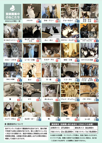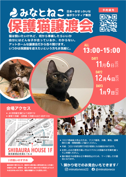 | イベント内容 | 2021年も250匹もの猫と里親さんのご縁を繋いだ毎月定期開催している譲渡会です。 ご予約はみなとねこのHPよりお願いします http://www.minatoneco.com 参加猫の詳細はこちら https://www.minatoneco.com/gallery 参加猫たちの様子はYoutubeのみなとねこチャンネルもご覧ください https://youtube.com/playlist?list=PLRxhCqU-Dt77IaUtZCDeratPPI7Jek6ZL ーーー 会場は明るく開放的な雰囲気です Youtube「みなとねこ譲渡会に行ってみよう」 https://youtu.be/8Q4Gti1swQk 25ケージ 60匹ほどの参加となりますが、それ以外の預かり宅の猫もご紹介可能です。 子猫は2匹ペアでの譲渡が原則です。 初めての方こそ最初から2匹をお勧めしています。 また私たちボランティアはご縁のあった猫たちに終生里親様に愛されて幸せに安全に暮らして欲しいと願っています。 このため里親になっていただくにはいくつかの条件やお約束事があります。 ■里親申込 事前誓約書 adobe.ly/35jdcb2 会場では申込書とお部屋のお写真を拝見してお迎えまでにご準備いただきたいことなどご説明します。 ■里親申込書 adobe.ly/2HqP1iI 会場にてご記入いただくことも可能ですが、お手元で印刷可能でしたら、ご記入の上ご来場いただくことをおすすめしております。 ※事前誓約書の3と4に該当がある方は是非事前にご相談ください。 また猫それぞれの月齢や保護主の考えにより、譲渡条件が加わる場合があります。 実際の参加予定猫は11/5(土)21:00までにみなとねこのHPやFacebookページでご紹介します。 https://m.facebook.com/minatoneco/ 直接ご応募の方は詳細をLINEなどでやりとりの上で預かり宅でのお見合いも行っております。 そうした中で譲渡会前に里親様が決定することもございますことご了承ください。 ※新型コロナの感染拡大防止の観点から予約優先、混雑時は入場をお待ちいただいたり、マスクの着用と消毒のご協力をお願いしております。 ※換気のためにドアをオープンしての開催のためにケージ越しでのご対面となりますことご理解ください。 ※譲渡会の開催や保護活動の継続のため、お一人様500円以上のご寄付をお願いしております。 |