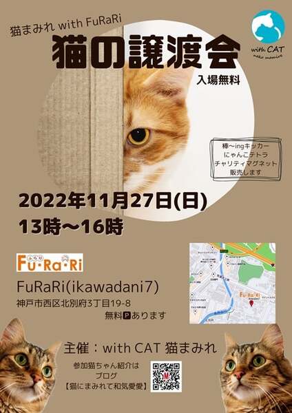| イベント内容 | 猫の譲渡会 2022年11月27日(日)13時~16時 神戸市西区北別府3丁目19-8 Fu・Ra・Ri(ikawadani7)無料パーキングあります 可愛い猫たちがたくさん参加していますので是非ご参加ください 参加のねこさんたちはブログにて掲載しています https://mycatkobe.blog.fc2.com/ ※無料ではございません ※譲渡条件がございます ※当日連れて帰れません 主催 with CAT猫まみれ |