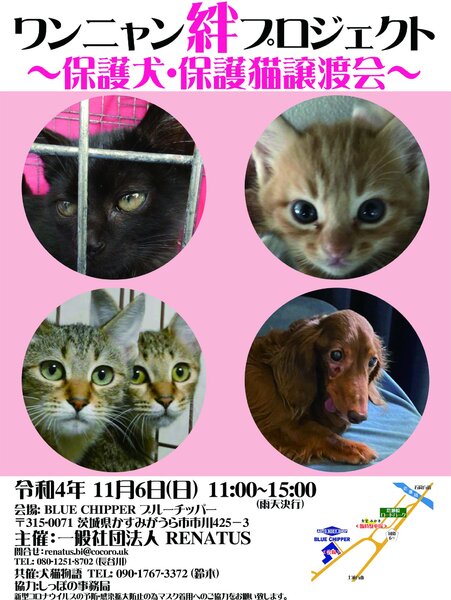 | イベント内容 | 犬猫の譲渡会です。Renatusマルシェ内での譲渡会となります。 美味しいお弁当や新鮮なお野菜と一緒にかわいいわんにゃんがお待ちしています! ぜひ足をお運びくださいませ。 かすみがうら市市川425-3 ブルーチッパー お問い合わせは09017673372鈴木まで。 (非通知のお問い合わせには対応できない場合がございます。ご了承くださいませ) |