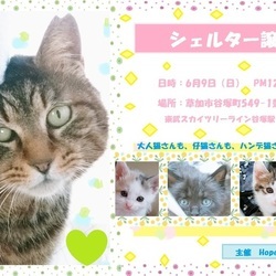 | イベント内容 | Hope to Life ~ 命に希望を 主に埼玉県動物指導センターに収容されてしまった負傷猫 過酷なお外で空腹や痛みに耐え生きている子たち 飼い主の身勝手な都合で捨てられてしまった子たちに 新しい希望の光、命の風を届けようと開催する譲渡会です。 Hope to Life ~いのちに希望を~ ※当日、譲渡会会場での猫のお渡しは致しません。 ※猫の譲渡に際しましては譲渡規約がございます。 |