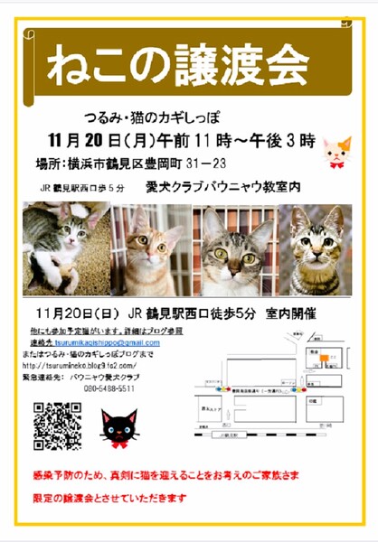 | イベント内容 | 11月20日(日)つるみ・猫のカギしっぽ 定例譲渡会を開催いたします 横浜市鶴見区豊岡町31-23 愛犬クラブバウニャウ 教室内 午前11時~午後3時 参加予定猫はこちら (順次掲載予定) 20日譲渡会参加予定猫一覧 感染予防のため: ①別室でお待ちいただくことがあります ②ネコを迎えることを真剣に検討されているご家族に 限定させていただきます 入場時にアンケートをご記入いただきます (連絡先等を含む) お問合せは会のメールアドレスにお願いいたします。 tsurumikagishippo@gmail.com 会の譲渡条件をあらかじめ御覧くださいませ (ブログ右上に「ご確認ください」とあります) 20220522171651f82.jpg (1654×2339) (fc2.com) |