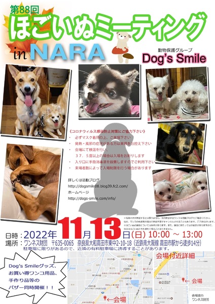 | イベント内容 | 11月13日(日曜日)、奈良県大和高田市のワンネス財団エモーショナルリテラシーセンターにて「第88回ほごいぬミーティングat奈良大和高田」を開催します。 保護犬を家族に迎えようと考えている方、保護犬に会ってみたい方、保護犬について知りたい方、ぜひご来場ください。 相性を見るためなど先住わんこさん、卒業わんこさんのご参加ももちろんOKです。 当日は、Dog's smileグッズやワンコ用品の販売、Dog's smileを応援してくださる方々が手作りされた手作り雑貨などの販売も行います。どれもお買い得です。 また、売り上げは、私たちの活動資金になります。ぜひご協力をお願いします。 来場者のみなさまには、コロナウイルス感染拡大防止に御協力をお願いします。 ・必ずマスクを着用の上、御来場ください。 ・発熱・風邪の症状のある方の入場は御遠慮願います。 ・入口にて検温を行い、37.5℃以上の場合は、入場をお断りします。 ・入場時は、手指消毒への御協力をお願いします。 ・来場者の状況により、入場制限を行う場合があります。 なお、来場予定のワンコについては、活動ブログでご確認ください。 日時 令和4年11月13日(日)午前10時~午後1時 場所 ワンネス財団エモーショナルリテラシーセンター 奈良県大和高田市東中2-10-18 (近鉄南大阪駅高田市駅から南に徒歩14分) 協力 ワンネス財団、株式会社松田電気工業 |
