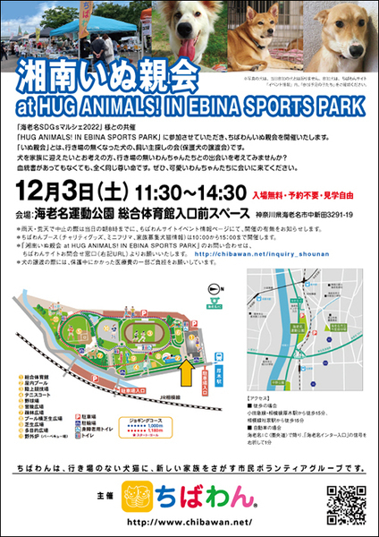 | イベント内容 | 急なお知らせで申し訳ございません。 運営メンバーにコロナ感染者が出たため 下記ご案内の「海老名SDGsマルシェ2022 HUG ANIMALS! IN EBINA SPORTS PARK」には不参加となりました。 そのため【ちばわん湘南いぬ親会】も中止となりました。 来場をご検討されていた方には誠に申し訳ございません。 「海老名SDGsマルシェ2022 HUG ANIMALS! IN EBINA SPORTS PARK」にちばわんブースとして参加します。 ☆ちばわん湘南いぬ親会(家族募集中のちばわんの保護犬が参加)11時30分〜14時30分 ☆チャリティグッズコーナー ☆ミニフリーマーケットコーナー ☆ちばわんで家族募集中の犬猫の「ワンニャンファイル展示」コーナー 詳しくはちばわんHPイベント情報でご確認ください https://chibawan.net/event_other/20221203-ebina-sportspark 【ちばわんからのお願い】 ①会場内ではマスクの着用をお願いします。 ②体温が37.5℃以上の場合、ご来場を見送っていただくようお願いします。 |