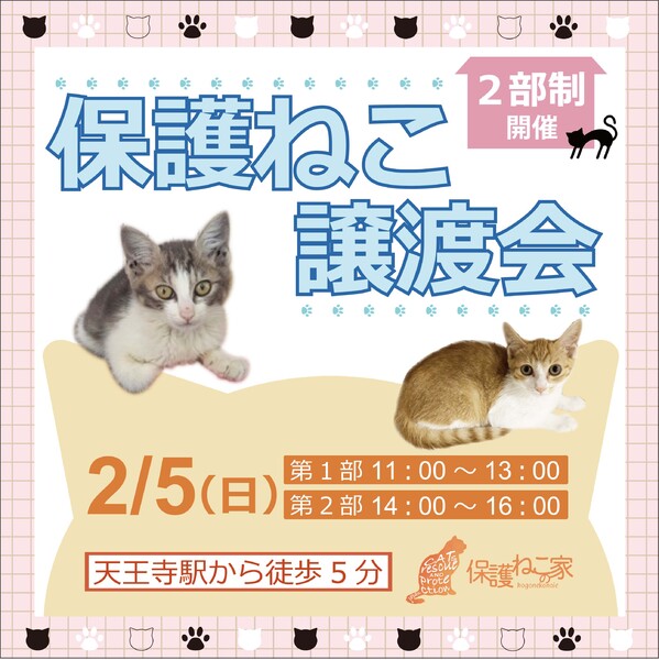 | イベント内容 | 毎月第1日曜の11時~13時と14時~16時の2部制にて【保護ねこの家 譲渡会】を開催しています。 会場は、大阪メトロ「天王寺駅」から徒歩5分と好立地。 交通の便が良く、会場横にはコインパーキングもあり大変便利です。 また、同日同時刻に【保護ねこの家 オンライン譲渡会】も開催しています。 子猫から大人猫までたくさんの保護猫たちが参加いたします。 是非、会場まで足をお運びください。 ▪日時 毎月第1日曜 第1部:11時~13時 第2部:14時~16時 ※1部と2部では参加猫が異なります ▪会場 Bear's Kitchen 大阪市阿倍野区旭町1丁目1-22 ▪交通機関 JR・大阪メトロ・近鉄線・阪堺線 ▪アクセス 大阪メトロ 天王寺駅 5番出口 西へ徒歩5分 会場横にコインパーキングあり ▪参加費 無料 ▪参加条件 予約や事前エントリーなど不要 未成年者のみ・高齢者のみのご来場はご遠慮ください ▪参加猫 https://ameblo.jp/hogonekonoie/theme-10113553723.html/ ▪お問合せ ホームページ「お問い合せフォーム」より https://www.hogonekonoie.jp/ask/ ▾詳しくは下記URLをご参照ください https://www.hogonekonoie.jp/jotokai/ |