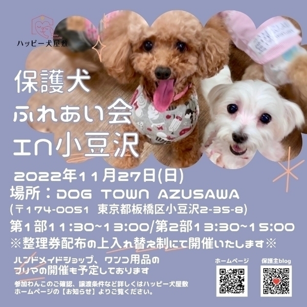 | イベント内容 | ドッグタウン小豆沢で開催のふれあい会のご案内です! 混雑を避けるため、整理券配布のうえ入れ替え制とさせていただきます。 ★整理券は各部の開始30分前より配布いたします。ご来場人数によってはご入場できない場合がございますので、あらかじめご了承ください。 (事前にホームページよりお見合いのお申込みをされている場合は、整理券不要にてご入場いただけますので、会場でスタッフにお伝えください) 日程:2022年11月27日(日) 時間:11時30分~15時00分 第1部:11時30分~13時00分 (整理券配布時間11時00分~11時30分) 第2部:13時30分~15時00分 (整理券配布時間13時00分~13時30分) 場所:ドッグタウン小豆沢(東京都板橋区小豆沢2-35-8) 【ご注意とお願い】 ※保護わんこ達はデリケートです。必ずスタッフの指示に従ってふれあって下さい。 ※感染対策の為マスクを着用の上、ソーシャルディスタンスにご協力下さい。 ※当日参加わんこを連れて帰ることは出来ません。 ※わんこのお申し込みは、ふれあい会ご来場後にホームページにあります【里親になる条件】を先にお読みになってからお願い致します。 ※お家のわんちゃんをお連れの時は、あらかじめオムツ又はマナーベルトとリードの着用をした状態でご入場をお願い致します。 ※わんちゃんのサイズ、吠えや攻撃性がある場合は入場をお断りさせて頂きますので、あらかじめご了承下さい。 ※新型コロナウイルスの感染状況により、中止や参加方法が変更する場合がございます。 ハッピー犬屋敷ホームページの「お知らせ」でご確認の上ご来場下さい。 ★皆さま、どうぞマナーを守ってのご来場をお願いいたします。 沢山の方のご来場を、スタッフ一同と可愛い保護わんこ達と一緒にお待ちしています! ●参加予定ワンコは、ハッピー犬屋敷ホームページの下記よりご確認くださいませ。 ↓ https://inuyasiki.com/2022/11/%e3%80%90%e6%9d%b1%e4%ba%ac%e6%96%b9%e9%9d%a2%e3%80%91%e5%b0%8f%e8%b1%86%e6%b2%a2%e3%81%b5%e3%82%8c%e3%81%82%e3%81%84%e4%bc%9a%e9%96%8b%e5%82%ac%e3%81%ae%e3%81%8a%e7%9f%a5%e3%82%89%e3%81%9b/ |