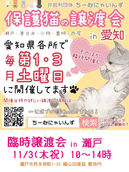 | イベント内容 | 2022年11月12日(土)に、 《瀬戸会場》(10時~14時) ★愛知県瀬戸市西本地町1丁目32番地 『株式会社 山田建材店』さん一階右側 ※駐車場あり(30台~) にて、 in瀬戸市☆子猫大集合の臨時譲渡会2022年11月12日(土)~ 非営利団体「ちーむ にゃいんず」 を開催します!! 当日は、瀬戸会場にて、当会が保護している数多くの子ネコさん達(40匹~50匹)の参加を予定しておりますので、是非ともお越しください! また、家に迎える猫さんをお探しの方や、これから猫を飼ってみたいと考えられている方、更には色々な『ネコ話』を聞いてみたい方など、是非お気軽にお越しください! ※見学無料・来場予約不要です。 ※新型コロナウイルス感染症拡大防止の為、来場時のマスク着用・検温・アルコール消毒液での除菌・少人数(2~3組)ごとの入場・送風機による場内換気・お車での順番待ちなど、様々な制約が生じてしまいますが、何卒ご協力の方をよろしくお願いいたします。 ※コロナ3密対策のため、事前予約のない《他団体のメンバー様》につきましては、ご来場や相談等、一切の対応をお断りさせていただいております。 【 主催 】 非営利団体 『ちーむ にゃいんず』 【 開催日 】 2022年11月12日(土) 【 譲渡会場 】 《瀬戸会場》(11時~16時) ★愛知県瀬戸市西本地町1丁目32番地 『株式会社 山田建材店』さん一階右側 ※駐車場あり(30台~) ◆ちーむにゃいんずの紹介ページ 【ちーむにゃいんず公式HP】 http://cat-rescue-team.org/ 現在も随時更新中です!(旧公式HP) 【ちーむにゃいんず公式amebaページ】 https://team-nyainz.amebaownd.com/ 地域に愛される保護猫団体を目指します! 【瀬戸観光協会公式HP内「ちーむにゃいんず」紹介ページ 】 http://www.seto-marutto.info/member-post/teamnyainz/ ◆フォローをお願い致します! 【ちーむにゃいんず公式Facebookページ 】 https://www.facebook.com/teamnyainz 【ちーむにゃいんず公式インスタグラム】 https://www.instagram.com/team_nyainz/ 【ちーむにゃいんず公式 Twitter 】 https://twitter.com/nyains_seto ◆お問合せ先について 【里親さん希望の方のお問合せ】 ホームページやSNS等で、気になる保護ネコさんを見つけ『是非ともオウチへ迎え入れたい!』と思った方は、 nekomadohouse@yahoo.co.jp こちらまで、ご連絡をお願い致します。 【 保護猫活動への参加希望の方 】 保護猫活動への参加希望の方や、興味のある方は、 nekomado1@yahoo.co.jp 09085503288(8時~20時くらい) ミナミまで、ご連絡をお願いいたします。 ◆只今、保護猫ボランティアのメンバーを大募集中です! 現在のところ、《瀬戸会場・豊明会場・春日井会場・小牧会場・西尾会場》のうち、3会場にて保護猫の譲渡会を定期開催(第1土曜日&第3土曜日)致しておりますが、愛知・岐阜・三重を中心にした中部地方全域にその活動エリアを拡大中です! 活動エリアが広いので、少し離れた方でも全然OKです! ※経験不問(未経験の方でも、サポートさせていただきます!) 【チビ猫さんのミルクボランティア】 生後~離乳までの赤ちゃん猫をご自宅で預かっていただき、ミルク授乳等を行っていただくボランティアです。 ※経験者さん大歓迎! 【子猫さん&成猫さんの預かりさん 】 離乳後の子猫から成猫をオウチで預かっていただき、譲渡会や個別のお見合い等からのトライアル開始の日まで、オウチで普通の生活の中で、猫たちのお世話を行っていただくボランティアです。 【 譲渡会当日のサポーターさん 】 受付・場内案内・保護主さんのサポートなど、譲渡会スタッフとして参加いただくボランティアです。 【譲渡会以外の日の宣伝活動 】 各媒体(SNS等を含む)での宣伝・チラシ配りや募金箱等の設置先紹介などを行っていただくボランティアです。 【保護猫シェルターで猫のお世話係】 保護猫のお世話(ゲージ・猫トイレ・食器等の清掃作業からブラッシングなど)を交代で行っていただくボランティアです。 【TNR、脱走猫の捜索活動 】 野良猫を増やさない為のTNR活動や、脱走してしまった猫の捜索活動を行っていただくボランティアです。 【物資の支援や応援等の協賛活動 】 当会への物資支援や応援協力を行っていただくボランティアです。 【その他、保護猫にかかわる活動 】 上記以外に保護猫にかかわる様々な活動を行っていただくボランティアです。 ※保護猫活動には、様々な活動がありますが、いずれかの保護猫活動にメンバーとして協力していただける方は、下記のメールアドレスまたは、携帯電話の方まで、お問い合わせください。 《お問合せ先》 非営利団体『ちーむ にゃいんず』本部 nekomado1@yahoo.co.jp 09085503288(8時~20時くらいまで) ミナミまで、お問い合わせください。 ◆非営利団体『ちーむ にゃいんず』団体登録状況 ・瀬戸観光協会 指定(会員)登録団体 ・瀬戸市社会福祉協議会(会員)登録団体 ・瀬戸市民活動センター(会員)登録団体 ・豊田市愛護センター 登録団体 ・名古屋市愛護センター 登録団体 ・岐阜県保健センター全11ヵ所 登録団体 (岐阜保健所、本巣・山県センター、西濃保健所、揖斐