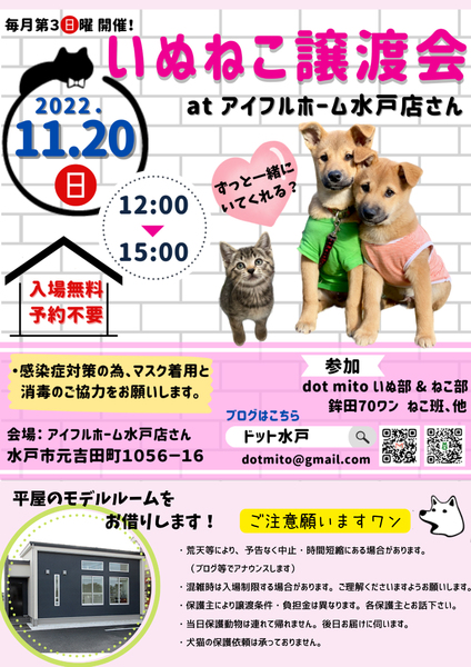 | イベント内容 | ★毎月 第3日曜 開催★ アイフルホームさん水戸店さんのご厚意により、 地域ボランティアが参加し譲渡会を開催することになりました。 保護犬、保護猫がお支度をして参加します。 保護犬猫を家族に迎えませんか。 ご家族皆さんでお見合いに来てください。 ●入場無料 ●予約不要(混雑時は時間を制限しながらご入場いただきます) ●アイフルホーム水戸店さんの平屋モデルルームにて開催 ★感染症防止の為、マスク着用と手指消毒のご協力をお願いします。 ★犬猫にも人にも思いやりのある行動をお願いします。 |