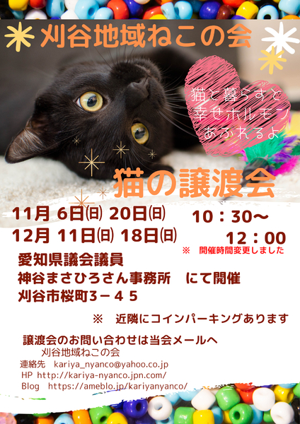 | イベント内容 | コロナウイルスの影響により、必ずマスク着用をお願い致します。 検温させて頂き、37℃以上の方は入場をお断りさせて頂きます。 ご来場いただいた方の数により、入場や時間を制限させて頂く場合がございます。 単身者・未婚のカップル、 60歳以上の方のみのご家庭は譲渡対象外とします。 (後見人がいる場合は例外ですが、同意書を頂きます) 希望者様条件(家族の同意、ペット可住宅、終生飼育、不妊去勢手術、ワクチンなど適正医療、 脱走防止具体策など)を確認させて頂きます。 その際は家族希望アンケートにご記入いただきます。 譲渡までのながれ < 面会 > 譲渡会へお越しいただく。 猫が決まったら家族希望アンケートを記入していただきます。 < お届け > 基本的に面会時のお渡しではなく、後日のお届けとなります。 当会から、担当の者が猫をご自宅までお届けし、飼育環境の確認をさせていただきます。 (脱走が強く懸念される場合は、譲渡をお断りする可能性があります。) ★ 遠方の方の場合は、往復の高速代をお願いしております。 < トライアル(お試し生活)> トライアル契約書を記入。 原則として期間は2週間程度(延長・短縮あり) この時点で譲渡金をお預かりさせて頂きます。 金額: 不妊手術していない猫 15,000円 不妊手術終了猫 20,000円 (2020.04月 改定しました) < 正式譲渡 > ★避妊・虚勢していない状態で譲渡する猫に関しましては、 手術終了後まで見守らせていただきます。 刈谷地域ねこの会 ホームページ http://kariya-nyanco.jpn.com/ Blog https://ameblo.jp/kariyanyanco/ |