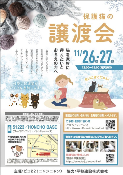 | イベント内容 | 2022年 11/26日(土)、27日(日) 時間:12:00~15:00(雨天決行) <猫を家族に迎えたいとお考えの方へ> ご家族に迎えていただき、生涯愛情を注いでいただける里親様をお待ちしています。 猫の飼育が初めての方には、丁寧にアドバイスもさせていただきますので、ご安心ください。 会場:51223/HONCHO BASE(ゴーイチニイニイサン/ホンチョーベース) 戸田市本町5-12-23 埼京線 戸田公園駅(西口)徒歩3分。 ※戸田公園駅西口ロータリーを出て、オリンピック通りの本町二丁目交差点を横断し直進してく ださい。 立て看板のある細い道を左折してください。 お車の方は、付近のコインパーキングをご 使用ください。 ※会場までのルートは、以下のサイト内の動画をご参考になさってください。 <譲渡会に関してのお願い> 新型コロナウイルス感染予防対策を万全に行い実施いたしますので、 会場内はマスクの着用をお願いいたし ます。ご出発前に検温をお願いいたします。 会場にお入り頂く前に検温・消毒をお願いいたします。 <譲渡会に参加をご検討の皆様へ> 会場内の蜜を避けるため、ご予約をお願いいたします。 予約なしでも可能ですが、ご予約優先となりますので、お外でお待ちいただくこともございます。 皆様のご理解、ご協力をお願いいたします。 ご予約は、以下のサイト内お問い合わせフォームよりお願いいたします。 ●ご予約・お問い合わせ:ピコ22(ニャンニャン)https://www.officemirai.com/cat ●保護猫の情報ブログ『保護猫活動日記』:https://ameblo.jp/toko-chino/ |