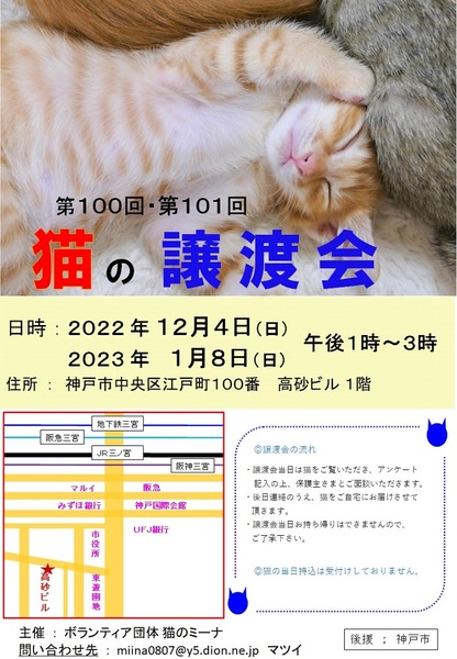 | イベント内容 | 今回は、大人猫も仔猫もたくさんの猫たちが参加予定です。 保護された猫たちが参加して、新しいお家を求めて参加します(=^・^=) 猫は後日こちらからお届けをさせて頂き、お家の環境を見せて頂ければと思います。 猫は20年くらい生きる子もいますので、ご自身の年齢に合った猫さんとの出会いを探しに来てください。 ペット不可にお住まいの方はご遠慮ください! 譲渡には条件が多数ありますので、ご理解くださいませ<m(__)m>。 まずはお試しで猫との相性を見てから、正式譲渡となります。 また、猫を参加させたい方も、募集していますのでお申し込みくださいね! アドレス miina0807@y5.dion.ne.jp にご連絡をください。 お越しの際は各路線の三宮駅からは徒歩10分くらい、車でお越しの場合は近隣のコインパーキングなどにお停めください。 当日、体調の悪い方、発熱がある方、このような方はご遠慮ください。 こちらでは、体温チェックや消毒をし、万全を期しております。 密にならないように、人数制限をしておりますので、お待ち頂く場合があります。 ブログ: 猫のミーナといっしょ http://miina300.blog.fc2.com/ ねこのオカン https://ameblo.jp/miina300/ |