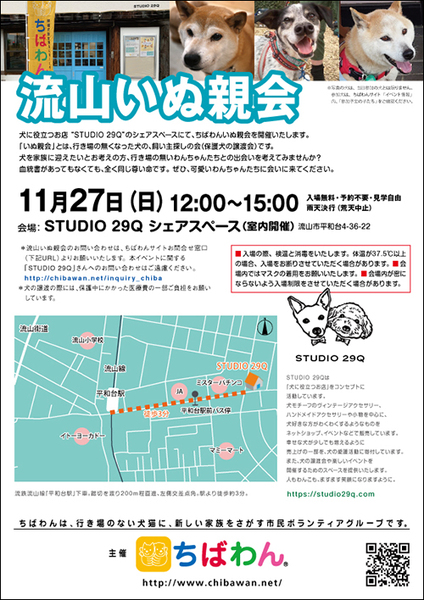 | イベント内容 | “STUDIO 29Q”にて第15回 流山いぬ親会を開催いたします。 飼い主探しをしている保護犬達に会いにきてみませんか。 【感染予防のため、ちばわんからのお願い】 ①会場内ではマスクの着用をお願いします。 ②入場の際、検温と消毒をお願いします。体温が37.5℃以上の場合、入場をお断りさせていただく場合があります。 ③密を避けるために、入場者数および入場時間の制限をする場合があります。また、入場制限の結果、入場をお断りさせていただく場合があります。 ※いぬ親会見学は予約等必要ありません。無料でどなたでも入場できます。ただし、感染予防のために入場をお断りさせていただく場合があります。 ※ネットによる募集も平行して行っているため、参加予定の犬が当日までに決定・不参加となる場合もあります。 ※イベントバナーに写真が掲載されている犬が参加するとは限りません。参加犬は本サイトに順次掲載されますのでそちらをご確認ください。 開催日:11月27日(日)12:00~15:00 室内開催:雨天決行 (荒天中止) 場所:STUDIO 29Q シェアスペース(2階) 千葉県流山市平和台4-36-22 【会場アクセス】 流鉄流山線「平和台駅」下車。踏切を渡り200m程直進、左側交差点角。駅より徒歩約3分。 駐車場はございません。当日お車の方は近隣のコインパーキングをご利用ください。 【注意事項】 《ご来場される皆様へのお願い》 臆病な性格の犬や、子供さんを苦手とする犬も参加しています。いきなり触ったりせず、まずボランティアに声をかけてください。 お子様と一緒にご来場される際には、手を繋ぐなどして頂き、お子様だけで参加犬に近づくことのないようご注意ください。 会場に同伴される犬には、必ずリード(引き綱)をつけてください。 【当日の流れ】 (1)家族募集中のいぬとお会いになりたい方はどなたでもご参加いただくことができます。ちばわんボランティアは名札をつけておりますので、ご遠慮なくお声をかけて下さい。また、募集中のいぬのそばには預かりボランティアが控えておりますのでいぬの性格や生活習慣など、遠慮なくご質問ください。 (2)ご希望のいぬが決まったら、お申し込みアンケートにご記入の上、ボランティアにお渡し下さい(前日までにメールでアンケートを送信してお申し込みいただくこともできます。) ◆「いぬ」アンケート送信先:https://chibawan.net/contactform_dog (3)アンケート内容を拝見し、お話させていただきます。 (4)原則として3日以内にお返事の連絡をさせていただきます。 (5)ご縁が成立した場合には、後日、こちらからご自宅までいぬをお届けし、約1ヶ月のお試し生活に入っていただきます。お届けの際に、書面での譲渡契約書を交わします。 ※ワクチン・不妊手術代など保護犬にかかった費用は、家族になるいぬ親さんにもご負担をお願いしています 【お知らせ】 ◆会場ではチャリティグッズを販売します 【お問い合わせ】 いぬ親会について:https://chibawan.net/inquiry_chiba ※いぬ親会当日はメールが見れません。また、お問い合わせの際は、必ず「具体的な件名」を入れて多数の迷惑メールと区別がつくようにお願いいたします。 流山いぬ親会イベントホームページ https://chibawan.net/event/20221127-nagareyama-dog ちばわんホームページ https://chibawan.net/ |