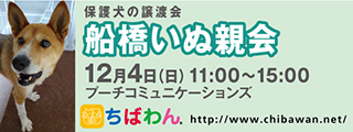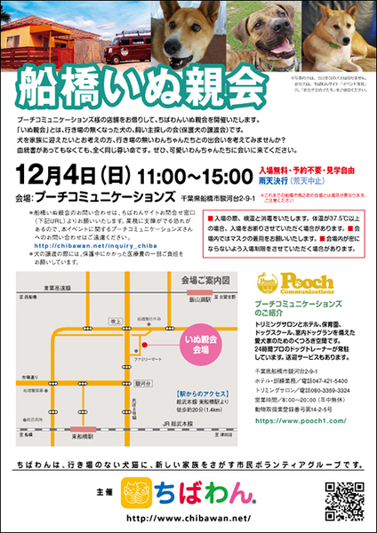 | イベント内容 | 12月船橋いぬ親会のご案内です。 poochさんのご厚意により、プーチコミュニケーションズ(船橋市駿河台)のドッグランをお借りして「船橋いぬ親会」を継続開催することになりました。 屋根付きのドッグランでの開催になります。 【ちばわんからのお願い】 ①会場内ではマスクの着用をお願いします。 ②入場の際、検温と消毒をいたします。体温が37.5℃以上の場合、入場をお断りさせていただく場合があります。 ③会場内が密にならないよう入場制限をさせていただく場合があります。 開催日:12月4日(日)11:00~15:00 屋外開催(屋根付きドッグラン) 小雨決行 場所:プーチコミュニケーションズ 千葉県船橋市駿河台2-9-1 【アクセス】 プーチコミュニケーションズ 飯山満駅から徒歩約20分 JR東船橋駅から徒歩約20分 県道8号線 吹上交差点~駿河台交差点間にあるファミリーマートの裏手になります。 リサイクルショップとファミリーマートの間の道へ進み、最初のT字路を左折してください。 ※店舗の駐車場は5台分のみとなりますので混雑時にはご利用いただけない場合がございます。 満車の場合はコインパーキングをご利用下さい。 《注意事項》 【当日の流れ】 (1)家族募集中のいぬとお会いになりたい方はどなたでも自由にご参加いただくことができます。ちばわんボランティアは名札をつけておりますので、ご遠慮なくお声をかけて下さい。また、募集中のいぬのそばには預かりボランティアが控えておりますのでいぬの性格や生活習慣など、遠慮なくご質問ください。 (2)ご希望のいぬが決まったら、お申し込みアンケートにご記入の上、ボランティアにお渡し下さい(前日までにメールでアンケートを送信してお申し込みいただくこともできます。) ◆「いぬ」アンケート送信先: http://chibawan.net/contactform_dog (3)アンケート内容を拝見し、お話させていただきます。 (4)原則として一両日中にお返事の連絡をさせていただきます。 (5)ご縁が成立した場合には、後日、こちらからご自宅までいぬをお届けし、約1ヶ月のお試し生活に入っていただきます。お届けの際に、書面での譲渡契約書を交わします。 ※ワクチン・不妊手術代など保護犬にかかった費用は、家族になるいぬ親さんにもご負担をお願いしています 《お知らせ》 ◆会場ではチャリティグッズを販売します 売上金は保護した犬猫の医療費など、 ちばわん活動費として大切に使わせていただきます 《お問い合わせ》 いぬ親会について:http://chibawan.net/inquiry_chiba ※いぬ親会当日はメールが見られません。また、お問い合わせの際は、必ず「具体的な件名」を入れて多数の迷惑メールと区別がつくようにお願いいたします。 ※本イベントに関するPoochさんへのお問い合わせはご遠慮ください。 船橋いぬ親会イベントホームページ https://chibawan.net/event/20221204-funabashi-dog ちばわんホームページ https://chibawan.net/ |
