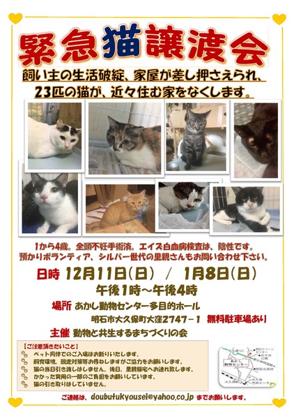 | イベント内容 | 明石市で多頭飼育崩壊。 いよいよ猫の住んでいる家屋が競売にかけられました。いつ退居を言い渡されるかわかりません。家を出ることになった時には、行政に引き取っていただくことを視野に入れざるを得ない厳しい状況です。 9月に、飼い主が生活破綻し、猫を助けてほしいと、あかし動物センターに相談された折りには、室内は、糞尿が堆積して、臭いもひどく、人も猫も住めない状態でした。 猫たはちは、こうした苦しい環境に3年あまり暮らしてきましたが、餌はかろうじて与えられていたようです。殆どが子猫の時に捨てられたのを飼い主が拾ってきたもので、皆おとなしい性格です。また、姿が可愛いです。 現在は、2階を猫の部屋とし隅々まで消毒し、可愛そうですが、三段ケージに入ってもらっています。 譲渡会参加は、猫にとって緊張の連続です。怖くてよだれを垂れたり、過呼吸になることもあります。でも新しいお家をみつけるため、頑張って参加しますので、どうかこの猫たちを見に来てください。 まだお家が決まっていない8匹が参加します。 ・1から4歳くらい ・避妊去勢手術済 ・エイズ、白血病共に全頭陰性 ・ノミダニ駆除済 お気軽にご連絡ください。 doubutukyousei@yahoo.co.jp 動物と共生するまちづくりの会 https://www.facebook.com/akasidoubutu/ |
