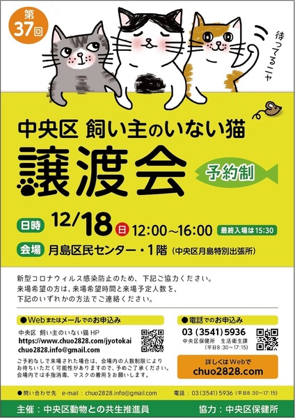 | イベント内容 | 中央区では様々な事情で飼い主のいないネコ達にずっとのおうちを見つけるために中央区動物との共生推進員が中心となって、譲渡会を定期開催しており今回で37回目を数えます。 区内の高齢者からの引き取りネコなど大人猫はもちろん、 一年を通して春先から初夏にかけて子猫の出産のピークを迎えるため、半年すぎの体調の安定した子猫が多いのが12月の譲渡会の特徴です。 子猫は月齢2ヶ月以上に成長し、健康状態に問題ないことが確認できると、譲渡会に参加できるようになりますが、まだまだ体調の急変もあるため、お留守番の多いご家庭への譲渡はご遠慮いただいておりますので、予めご了承のほどお願いいたします。 ネコとの暮らしをご希望されている方、ネコのお預り希望の方、またネコとの暮らしについて色々ご質問がおありになる方、皆様のご来場をお待ちしております。 ※里親を希望される方は、身分を証明できる物をご持参の上、当日会場まで直接お越し下さい。 会場内の混雑を防ぐため、事前に来場希望時間と来場予定人数をご連絡ください。 <譲渡会> 開催日:2022年12月18日(日曜日) 開催時間:12:00〜16:00(最終入場時間15:30) 会場:中央区月島区民センター 1階会議室 譲渡会の事前お申し込みはこちらから → https://www.chuo2828.com/jyotokai 里親さま募集中の猫ちゃんはこちら → https://www.chuo2828.com/catslist 参加猫の情報は、譲渡会の1週間前くらいにWebに掲載する予定です。 今回も1匹でも多くの猫さんたちに、新しい家族とのご縁が繋がりますように。 |