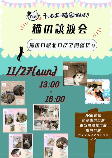 | イベント内容 | チーム犬・猫@かわさき 川崎市動物愛護センターに登録している個人ボランティアの集まりです。 TNR時に保護した子や愛護センターから引き出した子たちの譲渡会を開催しています。 当日参加する予定の猫達や募集中の猫さん達についてや、開催地開催日、 譲渡条件や譲渡の流れなどの詳細は ホームページ https://aipet.blog.jp/ インスタグラム https://www.instagram.com/team.inuneko.kawasaki/ |