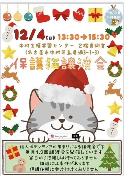 | イベント内容 | イベント内容 個人ボランティアの集まりによる猫の譲渡会です。 子猫20頭ほどと成猫も多数参加します お気軽にお越しください。今後も毎月2回開催予定です。 譲渡にはペット飼育可能のお住まいである等の条件があります。 当日のお渡しはしていません(お届けのみになります) 引き取りはできません。 ご相談等は混雑状況により後日改めてということになるかもしれませんが ご了承ください。 |