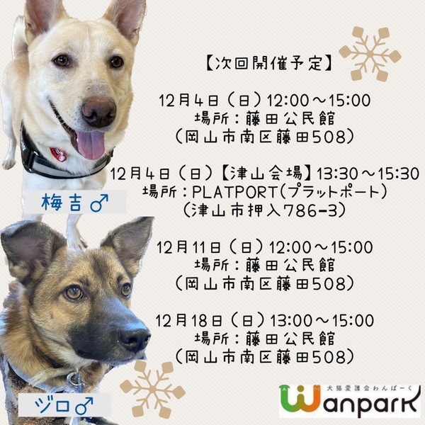 | イベント内容 | 12月4日(日)13時30分-15時30分、PLATPORTにて犬猫の譲渡会を開催します! ⚠️新型コロナウィルス感染症感染防止対策のため、発熱等、体調不良のある方は来場をお控えください。 来場の際はマスク着用の上、入場前の手指消毒と検温にご協力をお願い致します。 ご希望の子がいましたら、是非事前にホームページからお問い合わせ下さい! (⚠︎会場への直接のお問い合わせはお控えください) 【予約、お問い合わせ、詳細や日常の様子はこちらから↓】 ●HP https://www.wanpark.org/ https://www.instagram.com/wan89.okayama/ https://www.facebook.com/wan89okayama/ 予約優先、1組30分厳守のご案内です。 |