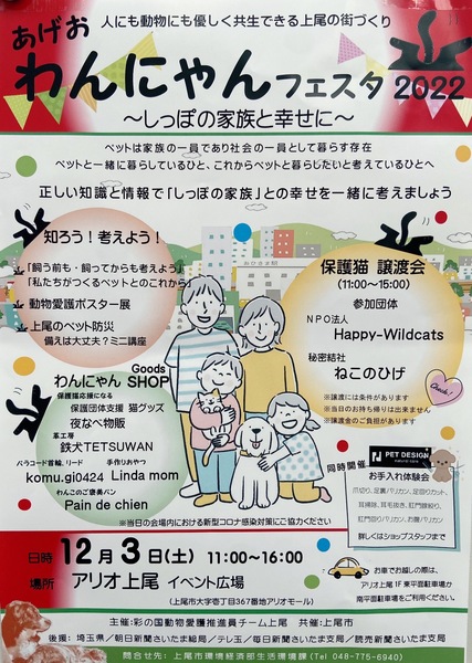 | イベント内容 | 2022年12月3日(土) 11:00~15:00は!! アリオ上尾で開催します 保護猫譲渡会に大集合ぉぉ♪♪ ⋆ ✩ ⋆ ┄ ⋆ ✩ ⋆ ┄ ⋆ ✩ ⋆ ┄ ⋆ ✩ ⋆ ┄ ⋆ ✩ ⋆ あげお わんにゃんフェスタ 2022 ~しっぽの家族としあわせに~ 【会場】アリオ上尾 イベント広場 (〒362-0046 埼玉県上尾市大字壱丁目367番地) 【主催】彩の国動物愛護推進員チーム上尾 【共催】上尾市 【後援】埼玉県、朝日新聞さいたま総局、テレ玉 毎日新聞さいたま支局、読売新聞さいたま支局 (敬称略) ⋆ ✩ ⋆ ┄ ⋆ ✩ ⋆ ┄ ⋆ ✩ ⋆ ┄ ⋆ ✩ ⋆ ┄ ⋆ ✩ ⋆ たくさんの方々のご尽力により たくさんの後援を頂き 大きな会場大きなイベント内で 譲渡会が出来る事となりました♪ イベント内容も盛りだくさん☆ その中のひとつの保護猫譲渡会に 秘密結社ねこのひげ インスタ @nnnkanto も参上します♪ ・:*。・:*三( o'ω')o 出店ブースには ・夜なべ物販 インスタ @yonayona2222 ・みー家 インスタ @charopondaifuku も参上♪ ・:*。・:*三( o'ω')o ✼ ••┈┈••ꕤ••┈┈•• ✼ はじめましての皆さまも いつもありがとうな皆さまも 会場でお会いできる事を 楽しみにしてます♪ |