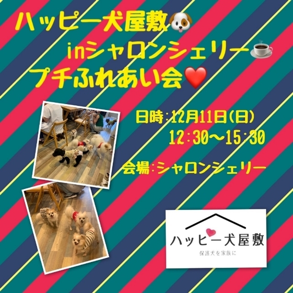 | イベント内容 | 千葉県松戸市のドッグカフェ・シャロンシェリーにて、プチふれあい会を開催いたします♪ ※予約制ではありませんが、混雑状況によりご入場をお待ちいただく場合がございますので、あらかじめご了承くださいますようお願いいたします。 ★ご来場の際のお願い★ ●ご来場の際は、カフェのご利用(ワンドリンクご注文)をお願いいたします。 ●わんちゃんご同伴の際は、マナーオムツの着用をお願いいたします。 ●お見合いの当日に、アピールとしてご自宅の飼育場所、安全対策などのお写真を撮ってきていただけると幸いです。 ※お問合せの前に、「ハッピー犬屋敷の里親の条件」をお読みいただきますよう、お願いいたします。 |