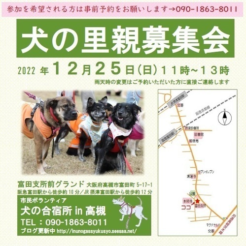 | イベント内容 | ※屋外会場での里親募集会です。 ※先住ワンちゃんを連れて会いに来て頂けます。相性を見るためにも、是非是非、連れてきてください。 ※近づきましたら「犬の合宿所in高槻」のブログで里親募集会情報や参加犬情報を紹介していきます。 → http://inunogassyukusyo.seesaa.net/article/494421067.html ※新型コロナウイルス感染予防対策として、予約制にさせて頂きます。 ご来場予定の方は事前にご連絡ください。 【予約・問合せ】 090-1863-8011 ・・・・・・・・・・ 【アクセス】 ・阪急京都線 富田駅から徒歩約10分 ・JR京都線 摂津富田駅から徒歩約12分 ※会場の広場の中に駐車して頂けますので、車で来場される方は事前にご連絡ください。 隣接する富田支所と公民館の駐車場は使えません。 ・・・・・・・・・・ 市民ボランティア「犬の合宿所in高槻」は、殺処分数の多い地方の保健所収容犬を引き取り、関西で新しい飼い主探しをしています。 保護犬を飼うことが文化として定着することで生体販売に伴う悲惨な繁殖犬の存在がなくなることと、 地方の収容犬を人口の多い地域で引き受けることで全体として処分数が減ることを目指しています。 ・・・・・・・・・・・・・・・・・・・・・・・・・・・・・ ★ 一時預かりさんや犬の搬送ボランティアさん、里親募集会の当日お手伝いの方など常時募集しています。 ★犬によっては個別お見合いできる場合があります。 里親募集会に参加できない方で個別お見合いをご希望の方は、預かりさんとの日程調整が必要ですので、電話でお問合せください。⇒090-1863-8011 ★参加犬等の最新情報は近付きましたらブログで紹介予定です。 |