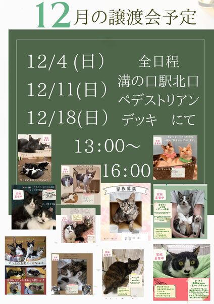 | イベント内容 | チーム犬・猫@かわさき 川崎市動物愛護センターに登録している個人ボランティアの集まりです。 TNR時に保護した子や愛護センターから引き出した子たちの譲渡会を開催しています。 写真の猫さんたちは当会メンバーが保護していて募集中の子たちですが、 譲渡会への参加は当日の体調やご機嫌によって決まりますので各SNSご確認ください。 当日参加する予定の猫達や募集中の猫さん達についてや、開催地開催日、 譲渡条件や譲渡の流れなどの詳細は ホームページ https://aipet.blog.jp/ インスタグラム https://www.instagram.com/team.inuneko.kawasaki/ |