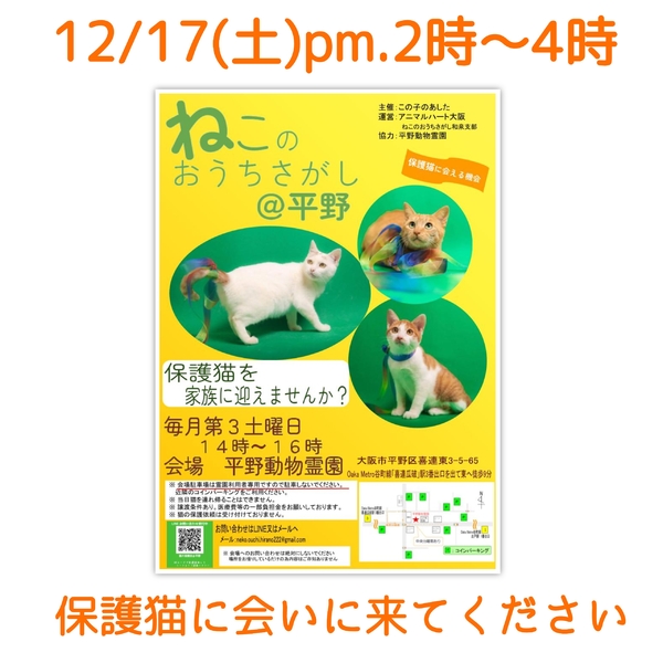 | イベント内容 | ねこのおうちさがし@平野 開催日 : 毎月第3土曜日 (次回12/17) 時間 : 午後2時~4時 場所 : 平野動物霊園 大阪府大阪市平野区喜連東3-5-65 Oaka Metro谷町線「喜連瓜破」駅、3番出口を出て東へ徒歩約9分 ☆会場へのお問い合わせは固くお断りします。 ☆平野動物霊園様の駐車場は霊園へのお参りのお客様専用ですので駐車しないでください。 保護猫里親会にお車でお越しの方は近隣のコインパーキングをご利用ください。 ※感染拡大の状況によっては急遽中止となる場合もございます。 ☆里親希望申込は先着順ではありません☆ 里親会終了後に検討させていただきますので、分散してご見学くださいますようご協力お願いします。 ★譲渡には完全室内飼育、同意書への署名・捺印などの条件、医療費等の一部負担があります。 ★猫さんは、後日お届けとなります。 当日連れて帰ることはできません。 ★参加予定の猫さんは、里親会の前に里親さまが決定する場合や、体調により不参加となる場合があります。 主催: この子のあした 運営: アニマルハート大阪 ねこのおうちさがし和泉支部 協力: 平野動物霊園 参加猫紹介ブログ https://ameblo.jp/konoasu222/ |