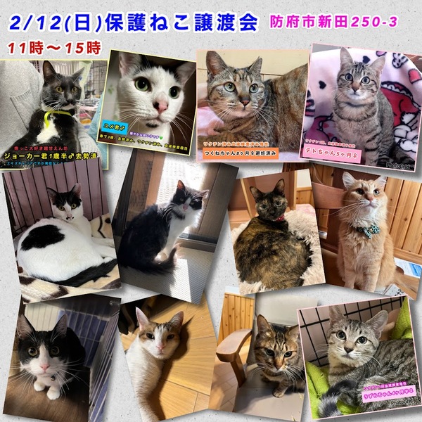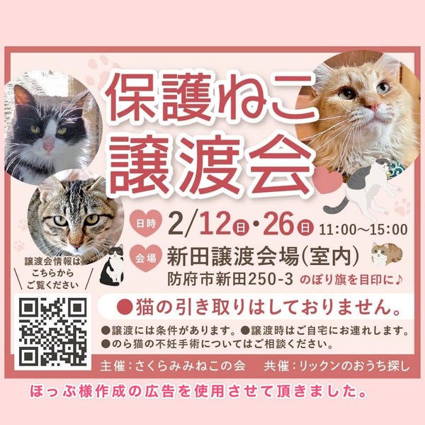 | イベント内容 | 防府市でTNR活動している「さくらみみねこの会」と譲渡ボランティア「リックンのおうち探し」の共催です。 TNRの現場で保護した子猫達、保健所からレスキューした子猫達などが里親さんを待っています。 猫ちゃん達は写真で見るより実際に見てもらった方が可愛いと思います。ぜひ足をお運びいただいて、運命の子との出会いを見つけてください。 *譲渡には条件がありますので、気になる子がいましたらお問い合わせください。 *参加予定の子は当日変更になる場合があります。 *感染症予防対策は会場でも行っておりますが、各自でも宜しくお願い致します。 *入場の際はマスク着用の上、手指消毒にご協力お願い致します。 *新型コロナウイルス感染拡大状況によっては急きょ中止になる場合もあります。 |