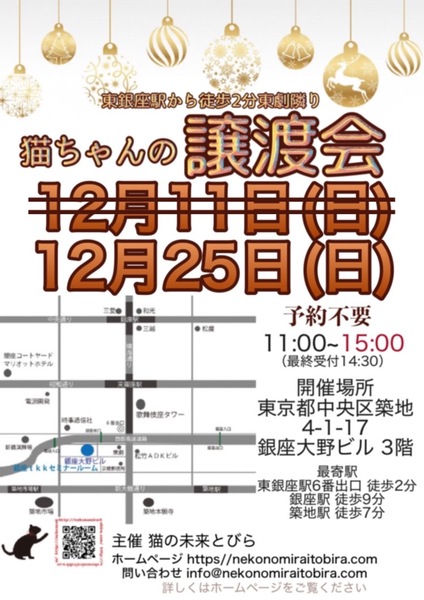 | イベント内容 | 東銀座で保護猫の譲渡会を開催しています「猫の未来とびら」です♪ 恵まれない環境にいる猫たちが未来へのとびらを開いて幸せなご縁に繋がる橋渡しをしていきます。 たくさんの猫ちゃんと保護主・スタッフ一同みなさまのご来場を心よりお待ちしています! 子猫ちゃん〜成猫ちゃんまで参加します♪ ※ご来場頂く方と私たち保護主、スタッフの安心と安全の為、感染リスクを限りなく低減させる為、私たちが出来うる対策をしてお待ちしております※ 【ご来場いただく皆様には下記についてお願い致します】 ★不織布マスクの着用をお願い致します。 (マスク着用のない方は入場出来ません) ★譲渡会場にお入り頂く前に検温・手洗いと手の消毒、検温をお願い致します。 ★ソーシャル・ディスタンス(人と人との間隔を開ける)をお願い致します。 ★熱のある方や体調の優れない方は譲渡会への来場を見合わせて頂けますよう、お願い致します。 ★来場者数によりましては人数制限もありますので長時間お待たせてする場合もございます。 予めご了承下さい。 コロナウイルス感染拡大防止の為、このような厳しいお願いで大変恐縮ですが何卒ご理解とご協力、ご了承をいただけますようお願い致します。 ★☆★★☆★★☆★★☆★★☆★★☆★★☆★★☆★★☆★ ★開催日時 2022年12月25日(日) 11:00~15:00(最終受付 14:30) ★会場 東京都中央区築地4-1-17 銀座大野ビル 3階 (東劇となり) ★最寄駅 東銀座駅 6番出口 徒歩2分 銀座駅 徒歩9分 ・築地駅 徒歩7分 駐車場は当ビル又は近隣のコインパーキング等をご利用ください。 会場への直接のお問い合わせはご遠慮くださいませ。 ★☆★★☆★★☆★★☆★★☆★★☆★★☆★★☆★★☆★ 会場で猫ちゃんと触れ合ってご縁を繋いでください。 里親様・猫ちゃんが双方、幸せな家族になれるよう保護主・スタッフがサポート致します。 ご不安な事はお気軽にご相談ください。 入場無料です。事前のご予約は不要です。 当日猫ちゃんの引き渡しはございません。 後日、保護主が里親様宅へお届けいたします。 ※参加予定猫ちゃんは、急な体調不良等で不参加になる場合もございます。 開催当日の朝、当会ブログにて不参加の最新情報を掲載致しますのでご確認をお願い申し上げます。 ◇譲渡に関してのお願い・基本条件 1.家族の一員として終生最期まで愛育下さい。 2.完全室内飼い・ペット可のお住まい(契約書を拝見致します) 3.脱走防止対策 4.避妊・去勢手術 5.里親様のご自宅へのお届け 6.譲渡誓約書への署名捺印・身分証明書の提示 7.医療費譲渡金のご負担 8.定期報告 9.トライアル期間有り ※保護主により譲渡条件は異なりますので会場で直接ご相談ください。 60才以上の方のみのご家庭、未成年の方、単身の方、同棲中の方、 小学生低学年以下のお子様のいる方、必要な脱走対策を施していただけない方は譲渡をご遠慮頂く場合もございますのでご了承ください。 仔猫の場合は主にお世話される方のご年齢は55歳までとさせて頂きます。 オーバーする方はご相談くださいませ。 小さな子猫の譲渡は体重が1kgになってからのお届けやお留守番の無い(少ない)ご家庭を希望いたします。 医療費譲渡金に関しましては詳しくはホームページの 【譲渡に関してのお願い】【譲渡の流れ】をご覧くださいませ。 ~主催 猫の未来とびら~ |