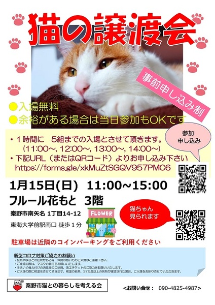 | イベント内容 | 猫の譲渡会を開催いたします。 コロナウイルス感染予防の観点から【事前申し込み予約制】となります。 みなさまのご来場をお待ちしております。 ※譲渡会に参加する猫ちゃんは、随時ホームページに掲載していきます。 https://hadanoneko.org/category/recruitment/ 日時:2023年1月15日(日) 11:00~15:00 会場:フルール花もと 3F 住所:神奈川県秦野市南矢名1丁目14-12 アクセス: 電車:小田急小田原線「東海大学前駅」南口より徒歩1分 車 :国道246号線 桜坂交差点より10分 東名秦野ICより20分 P無し 近隣にコインパーキング多数あります。 ● 完全予約制について 1時間に 5組までの入場とさせて頂きます。 (11:00~, 12:00~, 13:00~, 14:00~) 1時間毎の完全入れ替え制となります。 譲渡会へ入場申し込みされる方は 下記Linkから予約をお願いします。 折り返し予約確定のメールを送付させて頂きます。 https://forms.gle/dZ7WYLSB5pmxf5jQ8 尚、予約は1月1日(日) 9:00~より受付開始となります。 ● 感染防止対策 ・発熱や咳などの症状がある等 体調の悪い場合はご来場をご遠慮下さい。 ・ご来場の際は、マスクの着用をお願いいたします。 ・手洗いや備え付けの消毒液のご使用、咳エチケットのご協力をお願いいたします。 ・ご入場の際に検温をさせて頂きます。検温の結果、37.5度以上の発熱が確認された場合 ご入場をお断りさせていただきます。 |