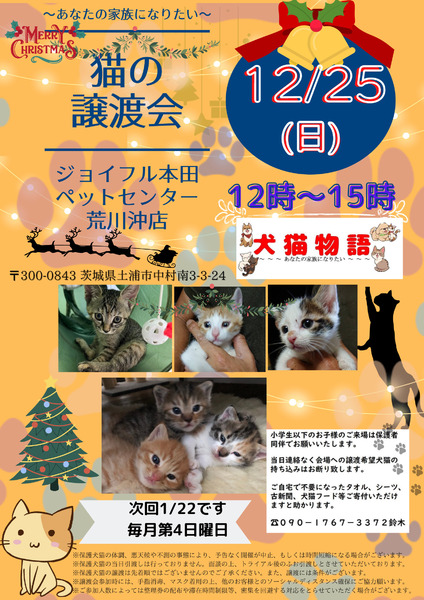 | イベント内容 | ジョイフル本田ペットセンター荒川沖店様での猫の譲渡会です。 子猫から大人猫まで、それぞれ魅力的な 可愛い猫があなたとの出会いをお待ちしています。 ぜひ足をお運びくださいませ。 会場は、ペットセンターのB館になります。 ●犬猫物語は土浦を中心とし保護活動、野良猫の避妊去勢などを行っている団体です。 犬猫の相談などはお電話くださいませ。 譲渡会への猫の参加も受け付けております。 当日いきなりの参加は不可能ですが、事前にご連絡ください。 問い合わせは09017673372鈴木。 非通知には出ません。 |