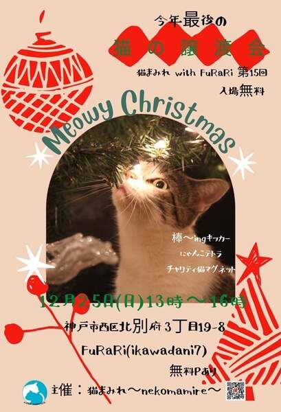 | イベント内容 | 猫の譲渡会 2022年12月25日(日)13時~16時 神戸市西区北別府3丁目19-8 Fu・Ra・Ri(ikawadani7)無料パーキングあります 可愛い猫たちがたくさん参加していますので是非ご参加ください 参加のねこさんたちはブログにて掲載しています https://mycatkobe.blog.fc2.com/ ※無料ではございません ※譲渡条件がございます ※当日連れて帰れません ※※早い順ではございませんがご縁があれば早くに決まってしまう 場合がありますのでお見合いの予約かお早めにご来場ください 主催 猫まみれ |