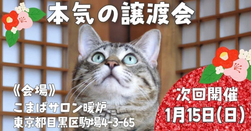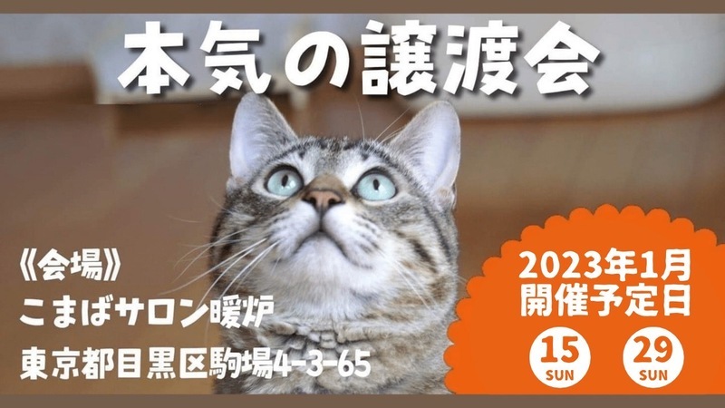 | イベント内容 | こまばサロン暖炉 〜本気の譲渡会〜 会いたい子がいる場合には、ぜひご予約の際にお伝えください♪ 複数の猫をご希望いただいてもOK♪ 子猫、成猫、キジトラなどざっくりした希望でもかまいません。 ※必ず主催者様のFBやInstagramをご確認ください。 ※事前予約でお声のかからなかった猫は、当日参加しない可能性があります。 [主催] 保護猫譲渡会カフェ こまばサロン暖炉 [Instagram] https://www.instagram.com/komaba.neko/ [FBページ] https://www.facebook.com/nyankomaba 【予約方法】主催者様宛メール予約 nyankoma222@gmail.com ●お名前 ●人数 ●会いたい猫の名前 ●時間(①13:00~ ②14:00~ ③15:00~ ④16:00~) 上記をご記入のうえご予約ください。 【会場】 東京都目黒区駒場4-3-65 レンタルスペースこまばサロン暖炉 ※最寄駅:駒場東大前駅 徒歩8分 |