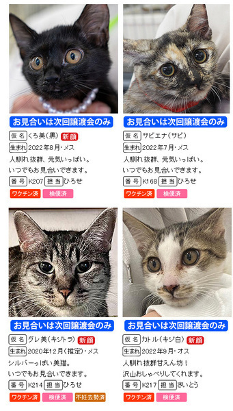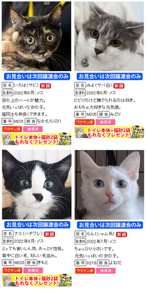 | イベント内容 | 初春譲渡会も子猫います!20匹がエントリー♪ 激カワ子猫多め!元気もりもり!やんちゃ盛り!! 元気に遊ぶ「我が子」を見に来てください。 http://miyoshineko.sblo.jp/article/190047518.html ※掲載していない子猫も参加します。 ●2023年は猫家族を迎えましょう● 1月8日(日)10時~15時 三好ヶ丘カリヨンハウスイベント広場 (愛知県みよし市三好丘2-2-1) *無料駐車場48台、近隣に大型コインPあり <ご来場前にお読みください> 体調不良等で不参加になる猫もございます。 混雑時は入場制限を行う場合があります。 猫は早いもの勝ちではございません。 すべての希望者とお話しをしてトライアル先は抽選で決まります。 当選された方のみ担当者からご連絡を差し上げます。 <譲渡までの流れ及び譲渡手数料> http://miyoshineko.sblo.jp/article/187085341.html ※一般参加の猫は譲渡基準、手数料が異なります。 ------------------------ 【NPO法人三好ネコの会】 http://miyoshi-neko.jp https://www.facebook.com/miyoshineko https://www.instagram.com/miyoshi_neko77 ・amazon欲しいものリストから支援お願いします http://miyoshi-neko.jp/fund |