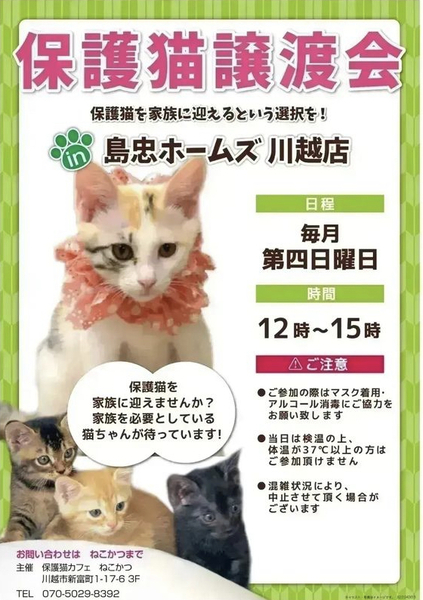 | イベント内容 | 保護猫カフェねこかつさん主催の保護猫譲渡会です? 川越店様での譲渡会では整理券の配布がございませんので、ゆっくりご参加いただけます。 たくさんの猫ちゃんがずっとのおうちを探していますので、ぜひ保護猫ちゃんを家族にお迎えください♡ |