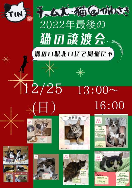 | イベント内容 | チーム犬・猫@かわさき 川崎市動物愛護センターに登録している個人ボランティアの集まりです。 TNR時に保護した子や愛護センターから引き出した子たちの譲渡会を開催しています。 写真の猫さんたちは当会メンバーが保護していて募集中の子たちですが、 譲渡会への参加は当日の体調やご機嫌によって決まりますので各SNSご確認ください。 当日参加する予定の猫達や募集中の猫さん達についてや、開催地開催日、 譲渡条件や譲渡の流れなどの詳細は ホームページ https://aipet.blog.jp/ インスタグラム https://www.instagram.com/team.inuneko.kawasaki/ ツイッター https://twitter.com/team12kwsk フェイスブック https://www.facebook.com/%E3%83%81%E3%83%BC%E3%83%A0%E7%8A%AC%E7%8C%AB%E3%81%8B%E3%82%8F%E3%81%95%E3%81%8D-101251259259132 |