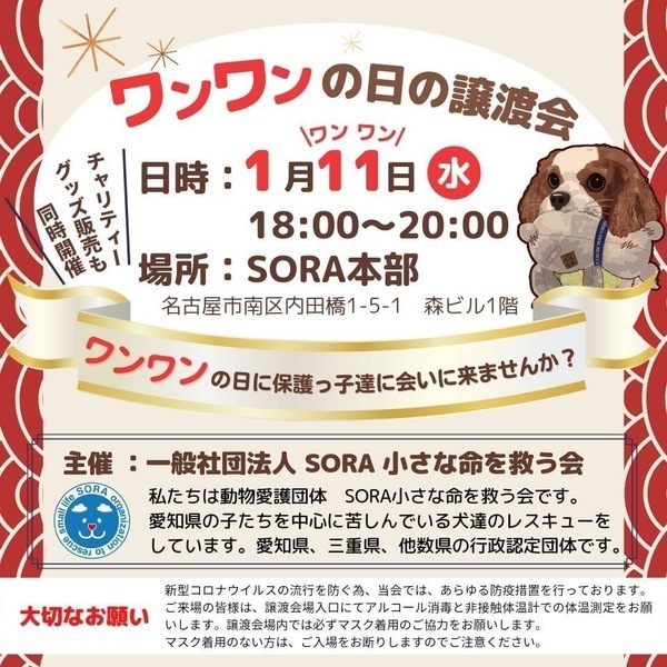 | イベント内容 | わんわんの日に譲渡会を行います。 ぜひ可愛い保護っ子達に会いに来て下さいね。 チャリティグッズ販売も同時に開催します。 |