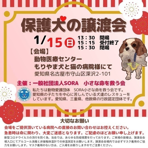 | イベント内容 | 保護犬の譲渡会を開催致します。 【注意】会場をご提供頂いている病院への直接のお問い合わせはお控えください。 急患時は命に関わり、大変ご迷惑となります。 ご配慮のほどお願い申し上げます。 もりやま犬と猫の病院さま 2階会議室 〒463-0811 名古屋市守山区深沢2-101 《ご注意》 家族希望ワンコがいる場合のお見合いに限定させていただきます。 事前のお申込みは不要です。保護活動ブログで、開催日の数日前に譲渡会参加が決定したワンコたちのご案内もしておりますので、ご希望のワンコの参加をご確認してお越し頂けますと幸いです。 なお、新型コロナウィルス感染拡大の状況におきまして、中止させていただくこともございますのでご了承下さい。 SORA公式ホームページ https://sora-chiisana.org/foster/ SORA公式活動メインブログ https://ameblo.jp/sora-chiisana-inochi/ SORAイベントブログ https://ameblo.jp/sora-charity-events/ |