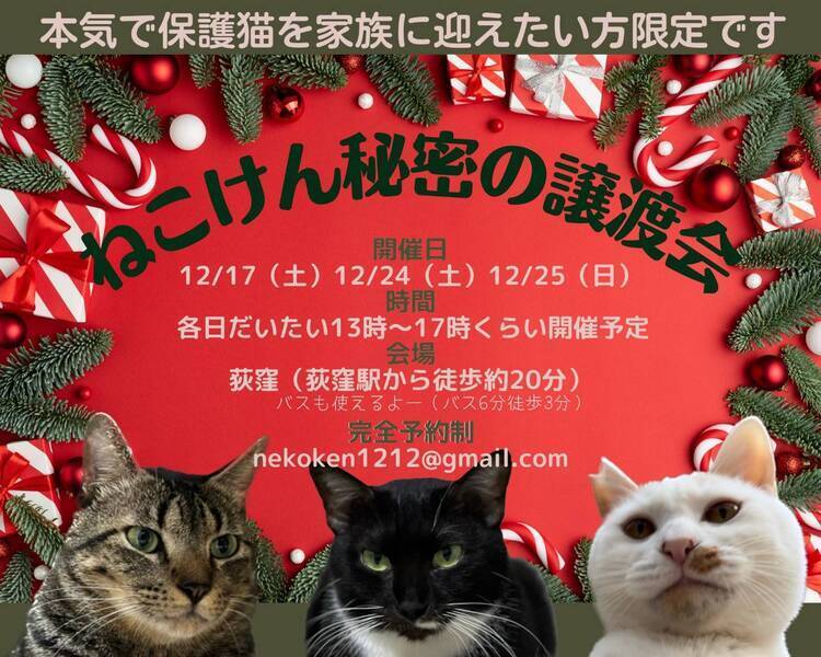 | イベント内容 | 【ねこけん秘密の譲渡会を開催!】 ★完全予約制★ 本気で保護猫を家族に迎えたい方限定です♡ [お見合い会場] 東京都杉並区のねこけん保護猫シェルター 荻窪駅より 徒歩20分 もしくは バス6分徒歩3分 ※ご応募の猫さんによっては会場が変わる場合がございます。 [予約方法] nekoken1212@gmail.com ↑こちらへメールをお願いします。 ①お名前 ②来場人数 ③ご希望の日時(第3候補くらいまでご提示いただけると助かります) ④会いたい猫さんの名前 日時と会場につきましては、メールにてご案内させていただきます。 ーーーーーーーーーーーーーーーーー ◆必ずお守り頂く事◆ ①終生飼養 ②完全室内飼養 ③年1回のご報告 ④ペット飼育可能な物件にお住まいであること ただし、以下の該当の方は、譲渡出来ない場合がございます。 ※学生、安定的な収入のない方 ※60歳以上の方は、成猫さんを家族に迎え入れることが出来ます。 里親様のご年齢に応じた成猫の譲渡となりますのでご相談ください。 ◆譲渡費用について◆ 不妊去勢手術・医療費の一部負担をお願いしております。 お届けエリアによっては往復高速料金(実費)を別途ご負担いただく場合がございます。 なお、交通費に関しましては正式譲渡に至らない場合であってもご返却できませんので予めご了承下さい。 ・ご希望の猫さんと家族になるまでの流れ ・譲渡時にかかる一部ご負担金などの詳細 ・譲渡契約書のサンプル等 下記URLに掲載しておりますのでご確認ください。 https://nekoken.jp/jotokai/joto-nagare/ https://nekoken.jp/jotokai/joutokibou/ ◆引き渡し方法◆ 1週間程度のトライアルの後、正式譲渡となります。 必ずご自宅までお届けします。 ◆お届け可能エリアについて◆ 応募可能エリア内であっても、遠方の場合アフターフォローの関係上お断りさせていただくことがございます。 ご心配な際は、前もって市区町村名や最寄り駅等をメールにてお問い合わせいただけますと幸いです。 お手数をおかけいたしますが、何卒ご了承くださいますようお願いいします。 [連絡先] ご質問等ございましたらお気軽にお問い合わせください。 NPO法人ねこけん東京本部 nekoken1212@gmail.com [ホームページ] https://nekoken.jp [Instagram] https://www.instagram.com/nekoken2222/ [ブログ・ボラ日記・YouTubeなど] https://linktr.ee/nekoken フォロー・チャンネル登録よろしくお願いします! |