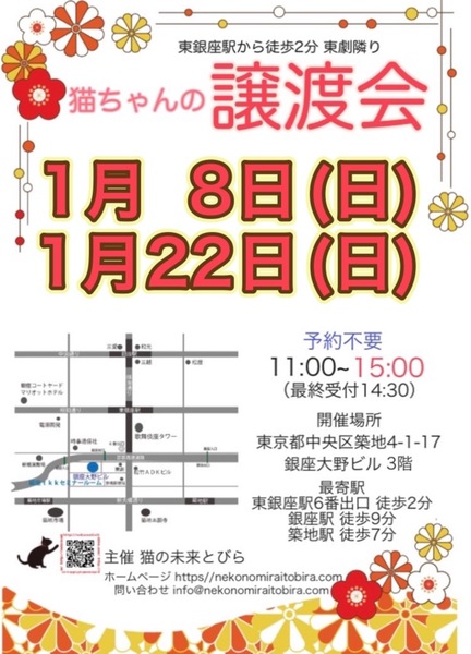 | イベント内容 | 東銀座で保護猫の譲渡会を開催しています「猫の未来とびら」です♪ 恵まれない環境にいる猫たちが未来へのとびらを開いて幸せなご縁に繋がる橋渡しをしていきます。 たくさんの猫ちゃんと保護主・スタッフ一同みなさまのご来場を心よりお待ちしています! 子猫ちゃん〜成猫ちゃんまで参加します♪ ※ご来場頂く方と私たち保護主、スタッフの安心と安全の為、感染リスクを限りなく低減させる為、私たちが出来うる対策をしてお待ちしております※ 【ご来場いただく皆様には下記についてお願い致します】 ★不織布マスクの着用をお願い致します。 (マスク着用のない方は入場出来ません) ★譲渡会場にお入り頂く前に検温・手洗いと手の消毒、検温をお願い致します。 ★ソーシャル・ディスタンス(人と人との間隔を開ける)をお願い致します。 ★熱のある方や体調の優れない方は譲渡会への来場を見合わせて頂けますよう、お願い致します。 ★来場者数によりましては人数制限もありますので長時間お待たせてする場合もございます。 予めご了承下さい。 コロナウイルス感染拡大防止の為、このような厳しいお願いで大変恐縮ですが何卒ご理解とご協力、ご了承をいただけますようお願い致します。 ★☆★★☆★★☆★★☆★★☆★★☆★★☆★★☆★★☆★ ★開催日時 2023年1月8日(日) 11:00~15:00(最終受付 14:30) ★会場 東京都中央区築地4-1-17 銀座大野ビル 3階 (東劇となり) ★最寄駅 東銀座駅 6番出口 徒歩2分 銀座駅 徒歩9分 ・築地駅 徒歩7分 駐車場は当ビル又は近隣のコインパーキング等をご利用ください。 会場への直接のお問い合わせはご遠慮くださいませ。 ★☆★★☆★★☆★★☆★★☆★★☆★★☆★★☆★★☆★ 会場で猫ちゃんと触れ合ってご縁を繋いでください。 里親様・猫ちゃんが双方、幸せな家族になれるよう保護主・スタッフがサポート致します。 ご不安な事はお気軽にご相談ください。 入場無料です。事前のご予約は不要です。 当日猫ちゃんの引き渡しはございません。 後日、保護主が里親様宅へお届けいたします。 ※参加予定猫ちゃんは、急な体調不良等で不参加になる場合もございます。 開催当日の朝、当会ブログにて不参加の最新情報を掲載致しますのでご確認をお願い申し上げます。 ◇譲渡に関してのお願い・基本条件 1.家族の一員として終生最期まで愛育下さい。 2.完全室内飼い・ペット可のお住まい(契約書を拝見致します) 3.脱走防止対策 4.避妊・去勢手術 5.里親様のご自宅へのお届け 6.譲渡誓約書への署名捺印・身分証明書の提示 7.医療費譲渡金のご負担 8.定期報告 9.トライアル期間有り ※保護主により譲渡条件は異なりますので会場で直接ご相談ください。 60才以上の方のみのご家庭、未成年の方、単身の方、同棲中の方、 小学生低学年以下のお子様のいる方、必要な脱走対策を施していただけない方は譲渡をご遠慮頂く場合もございますのでご了承ください。 仔猫の場合は主にお世話される方のご年齢は55歳までとさせて頂きます。 オーバーする方はご相談くださいませ。 小さな子猫の譲渡は体重が1kgになってからのお届けやお留守番の無い(少ない)ご家庭を希望いたします。 医療費譲渡金に関しましては詳しくはホームページの 【譲渡に関してのお願い】【譲渡の流れ】をご覧くださいませ。 ~主催 猫の未来とびら~ |