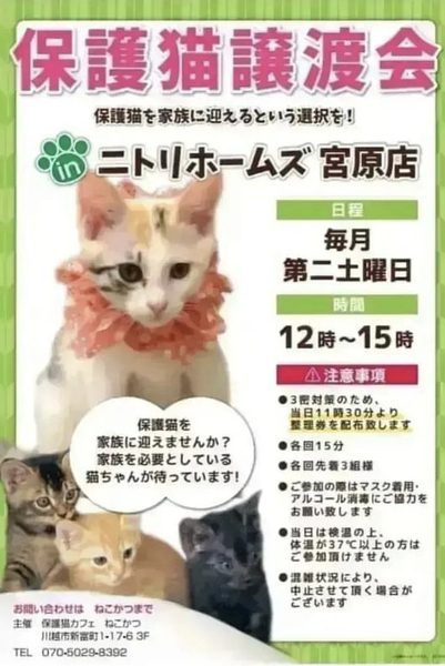 | イベント内容 | 保護猫カフェねこかつさん主催の保護猫譲渡です☺︎ 1階ペット用品売り場にて開催しています。 当日の11時半から整理券を配布致します。 整理券はなくなり次第配布終了となります。 可愛い猫ちゃんがたくさん参加しますのでぜひ遊びに来てください☆*:. |