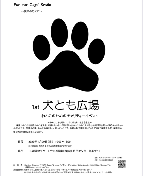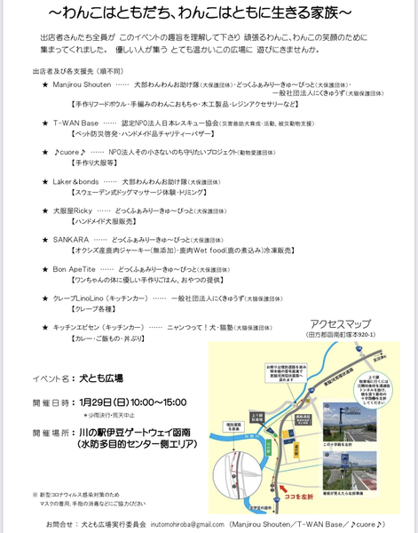 | イベント内容 | 犬部にいつもご協力くださっている方が主催しているイベントです。ぜひ足をお運びください。 『犬とも広場』は 保護犬や使役犬を支援・応援するチャリティーイベント。 会場に並ぶわんこ関連のブースやキッチンカーでお買い物・体験をしていただくだけで、わんこのためのチャリテイーにつながります!お気軽に楽しみながらわんこの応援をしてみませんか。 『犬とも広場』 2023年1月29日(日)10:00~15:00 ※小雨決行、荒天中止 於川の駅伊豆ゲートウェイ函南 川の駅はお散歩や無料ドッグランで、愛犬と一緒に楽しめるステキなスポットです! 譲渡会ではありません。 詳細はこちらをどうぞ! https://instagram.com/team_inutomo?igshid=YmMyMTA2M2Y= |
